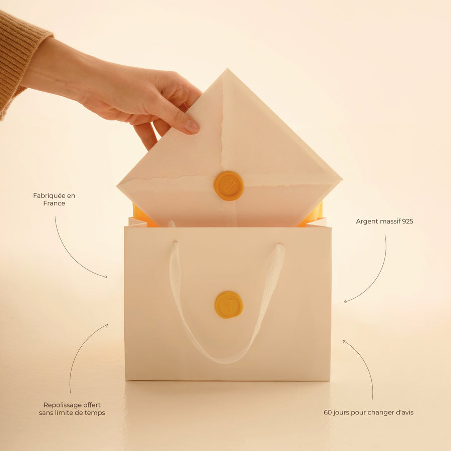 Each ALT jewel is presented in a cotton pouch accompanied by a gift envelope handmade from recycled hemp and linen in France.